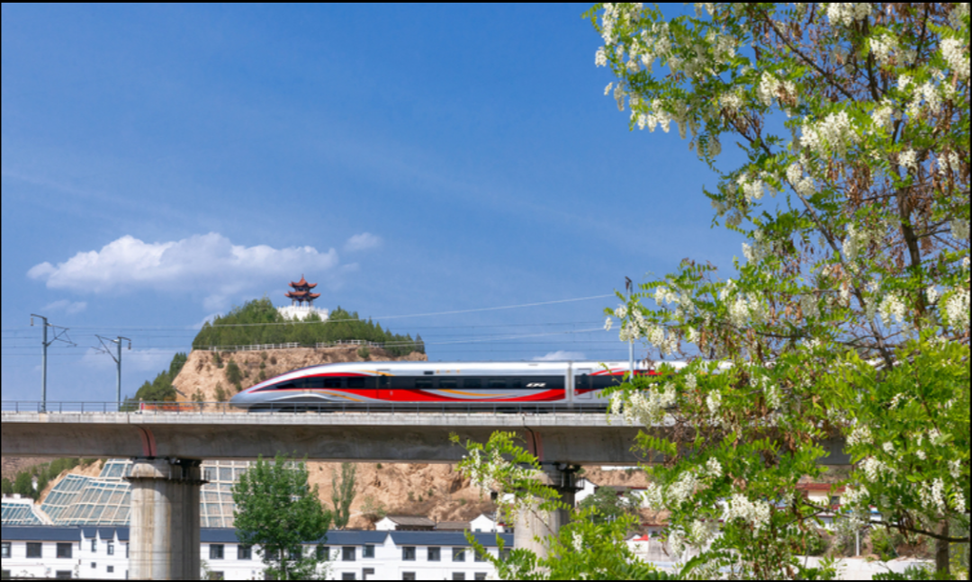 “龙凤呈祥”,舞动西部山河。5月2日,宝兰高铁沿线正是槐花盛开季节,一列复兴号智能型动车组,行驶在天水南至秦安区间,带着一路槐香从渭红新村驶过。复兴号智能型动车组,外形涂装采用传统“龙凤呈祥”主题,银灰色车身,“龙型”车头,由“国旗红”“故宫红”“祥龙黄”组成三色“凤尾”上下舞动、交织缠绕车身,寓意“龙腾四海、凤舞九天”,充满传统文化韵味,表达了对祖国繁荣昌盛、人民幸福安康的美好祝福。