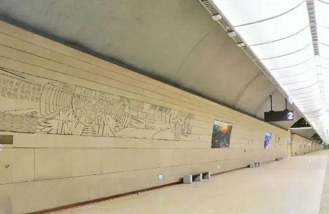 你注意过八达岭长城站站台墙面上的壁画吗?在1站台的隧道里,一组岩石壁画包含着京张铁路的车站、老机车等元素,讲述了百年前京张铁路的故事;在2站台,同样有一组岩石壁画,复兴号动车组、三臂台车穿插其中,讲述了建设京张高铁的故事。下次来这里乘车,记得看一看!