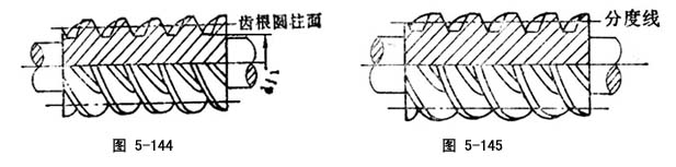 圆柱蜗杆的分度曲面是圆柱面,称蜗杆分度圆柱面(图5-142),它是蜗杆轮齿几何尺寸的计算基准面。它把轮齿分成了齿顶高和齿根高,在分度圆柱面上的齿厚、齿槽宽通常规定为标准值。