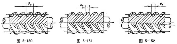 蜗杆一个螺旋齿,在轴向平面内有两条齿廓线,该两条齿廓线在分度线上量得的距离称轴向齿厚。轴向齿厚一般规定为标准值,其大小与径向变位量无关,阿基米得蜗杆规定为:sx=0.5πm。轴向圆弧齿圆柱蜗杆规定为:sx=0.4πm(图5-151)。